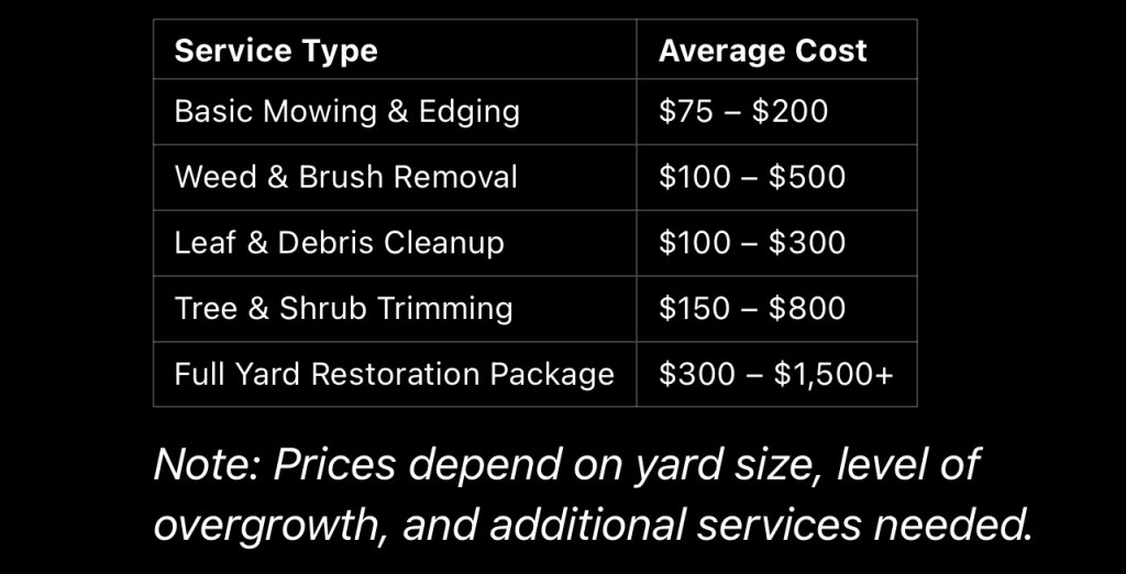Cleanup prices vary based on the level of overgrowth, yard size, and labor required. Here’s what you can expect to pay:
