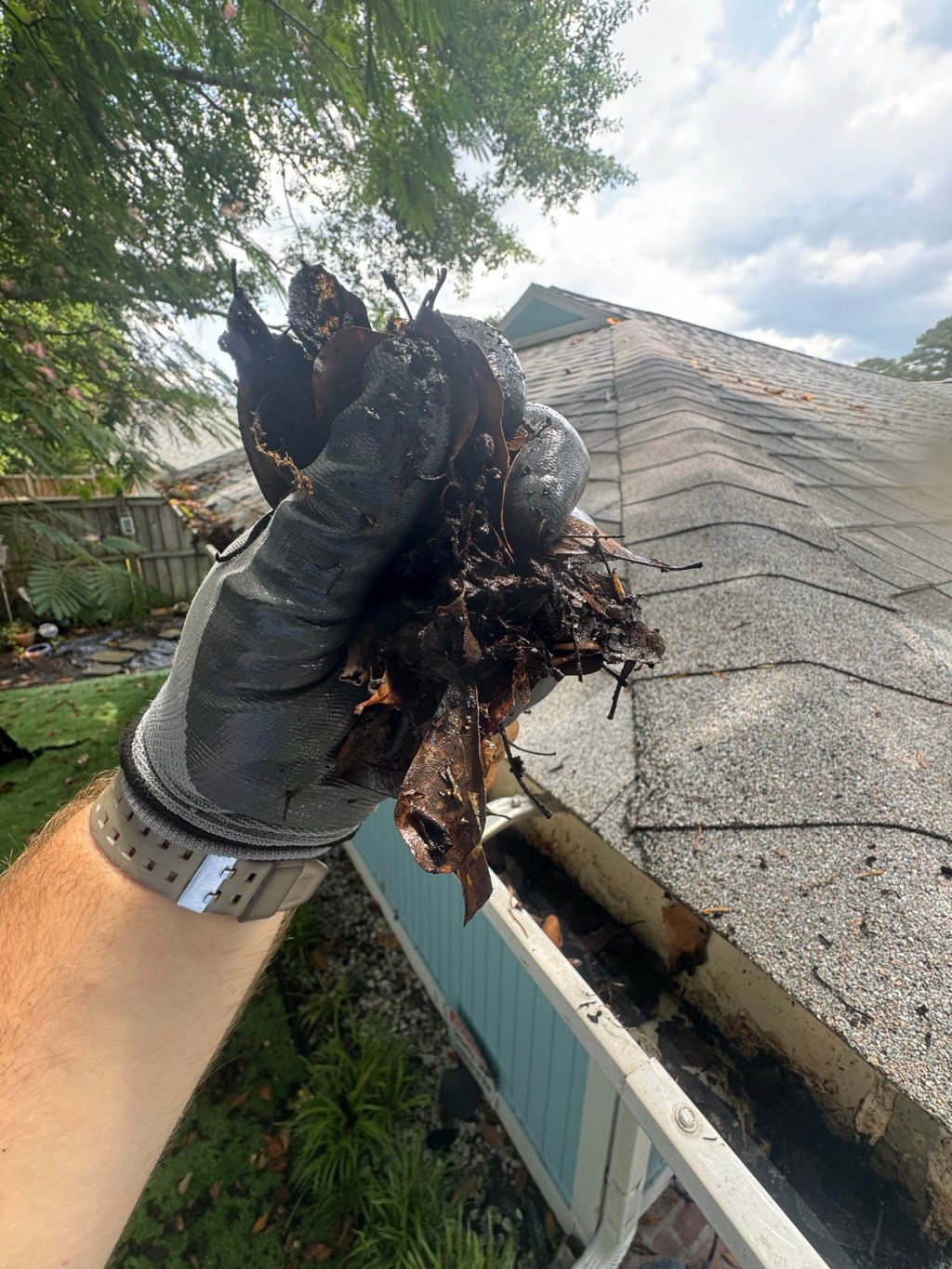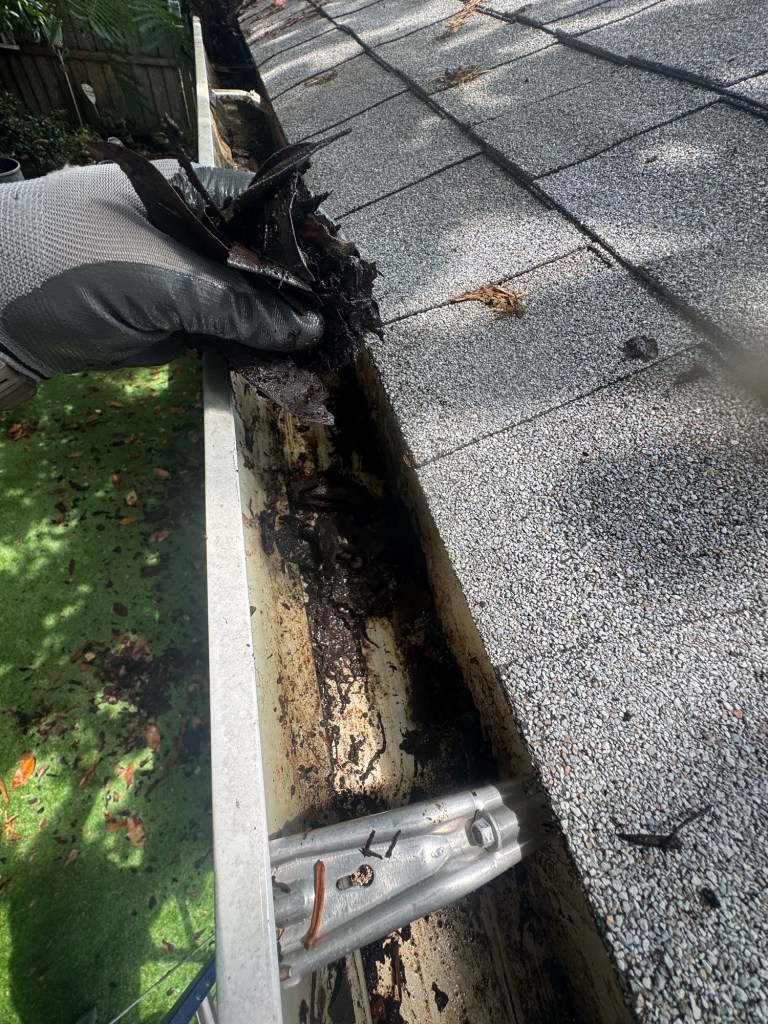 Over time, leaves, twigs, and dirt break down into a thick, heavy sludge like this. It clogs water flow, traps moisture, and becomes a breeding ground for pests. In the worst cases, it can cause: